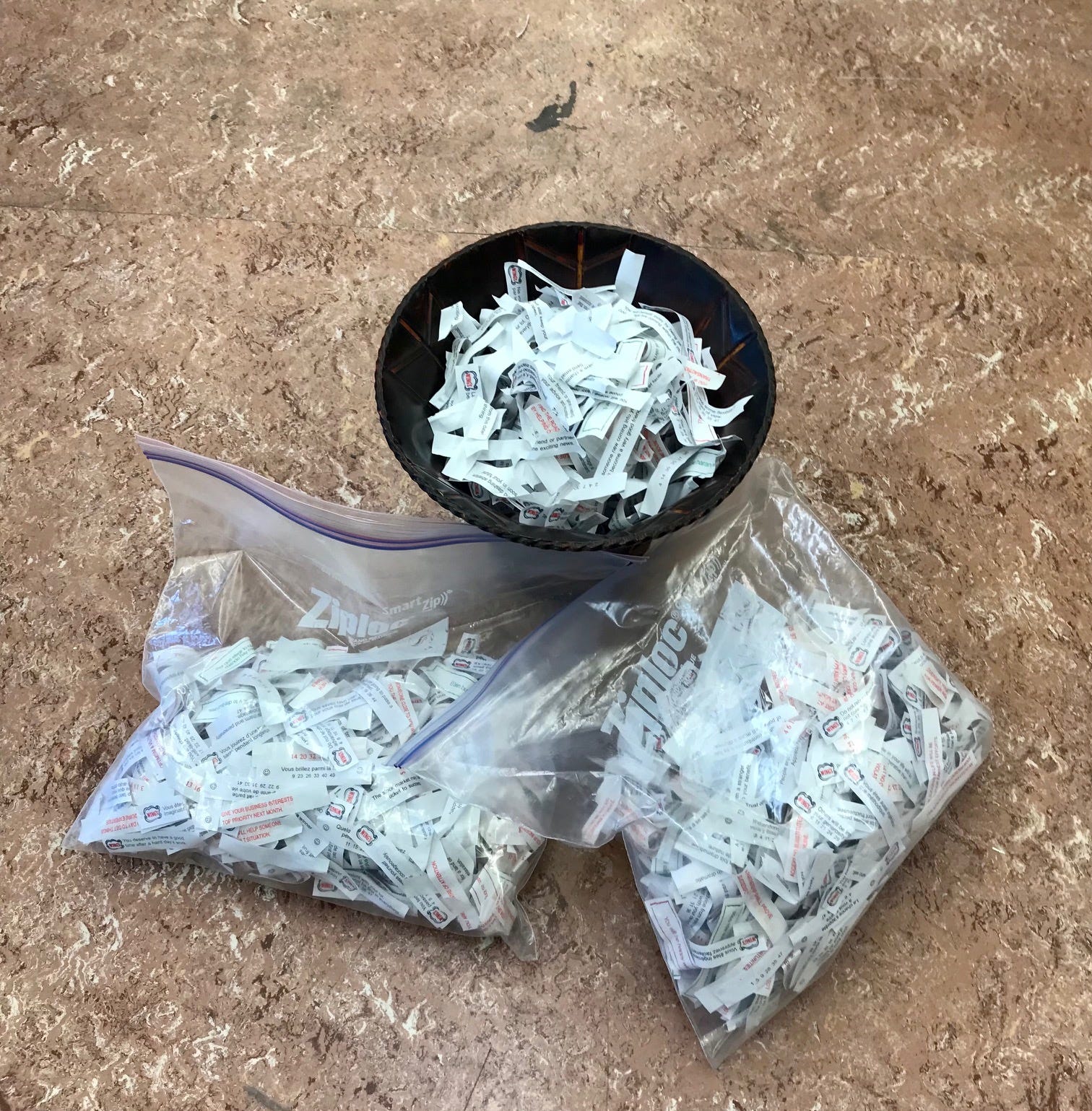 Someone donated their lifetime collection of, most likely, fortune cookie fortunes. I had the arts ventures students grab one a day to keep the fortune going.